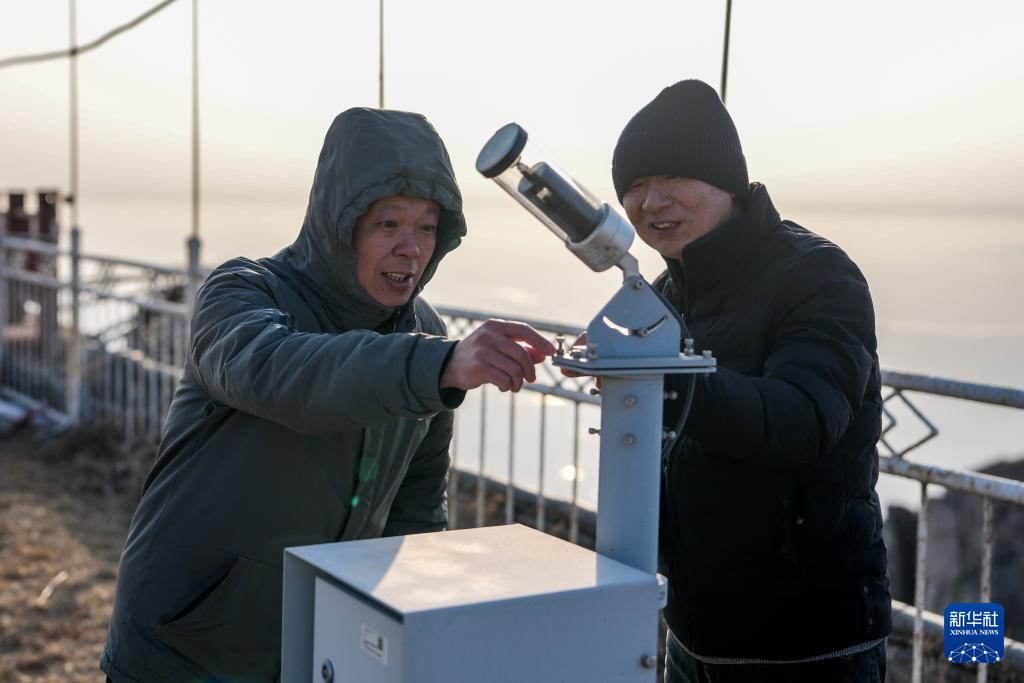 2月7日,副站长杨瑞峰(左)和观测员刘恒德在泰山气象站观测场内检查仪器设备。