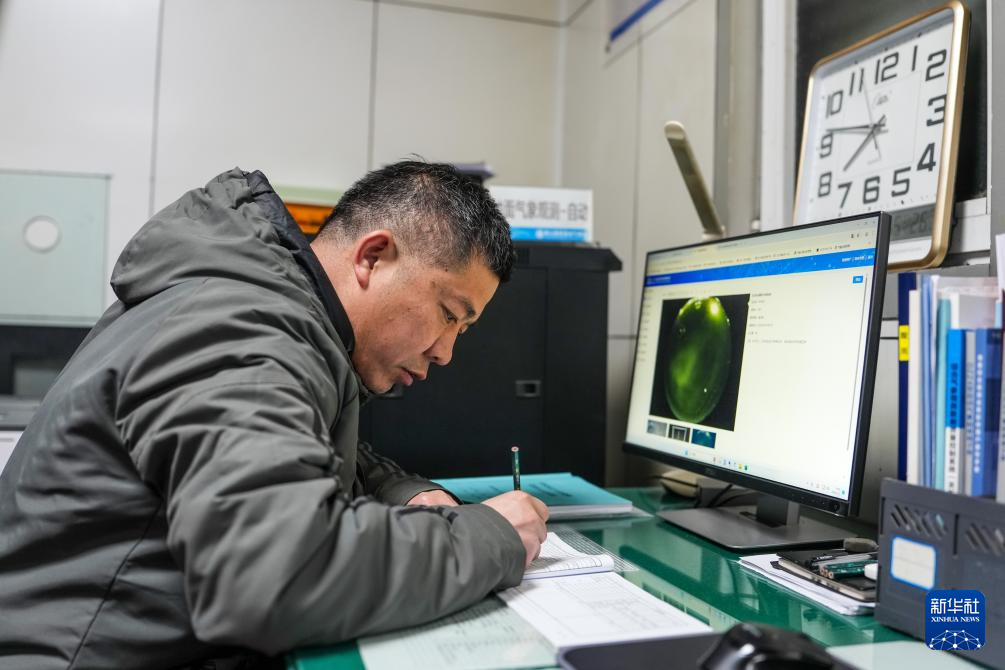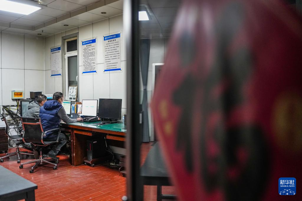 2月6日,观测员杨正民(左)、刘恒德在值班室监测气象数据。
