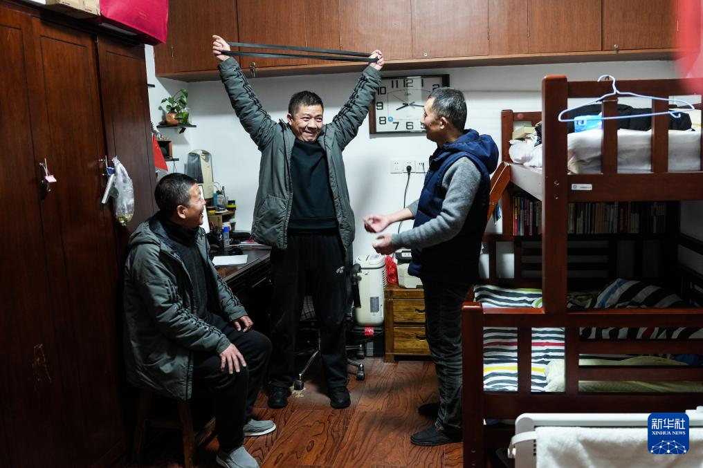 2月6日,观测员杨正民(中)、刘恒德(右)和副站长杨瑞峰在宿舍内锻炼身体。