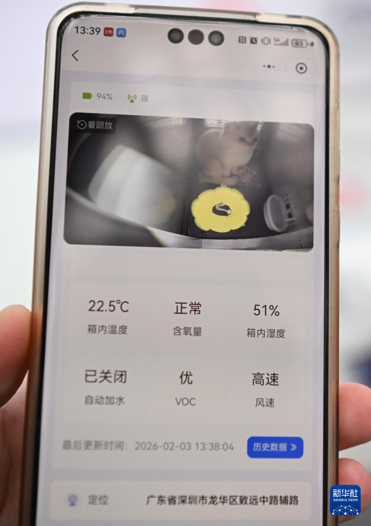 2月3日,在深圳北站中铁快运营业部,工作人员展示宠物托运专用箱内的视频画面。