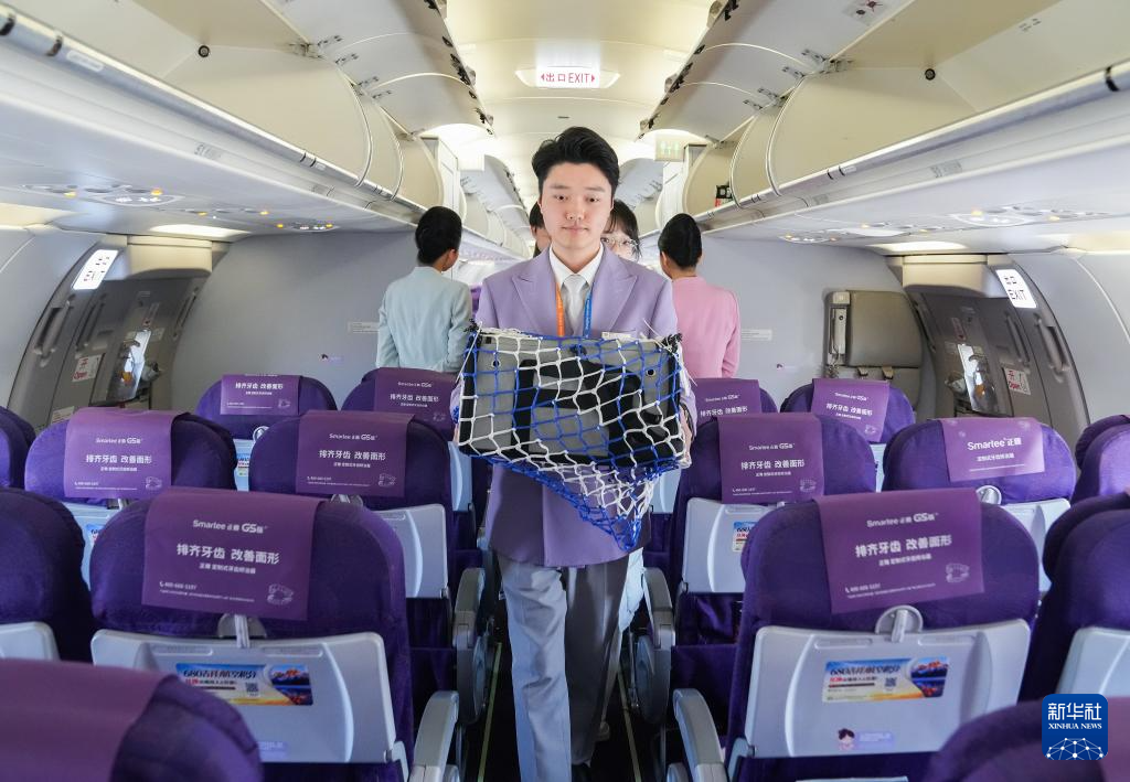 2月3日,在上海飞往成都的HO1059次航班上,吉祥航空工作人员将宠物猫“好好”搬进机舱。