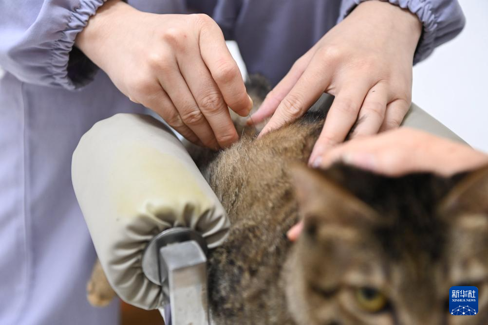 2月1日,在广西南宁一家从事宠物寄养业务的宠物医院,工作人员为猫针灸。