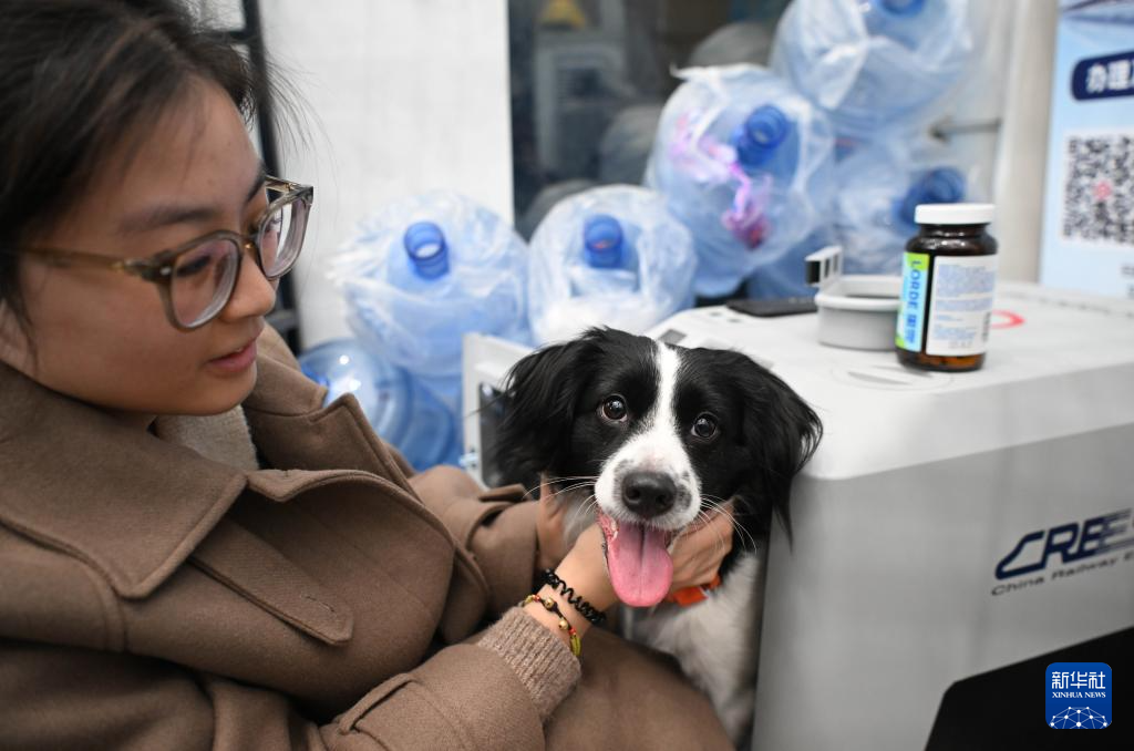 2月6日,在合肥南站站台,工作人员在“高铁宠物运输箱”装车前查看宠物状态。