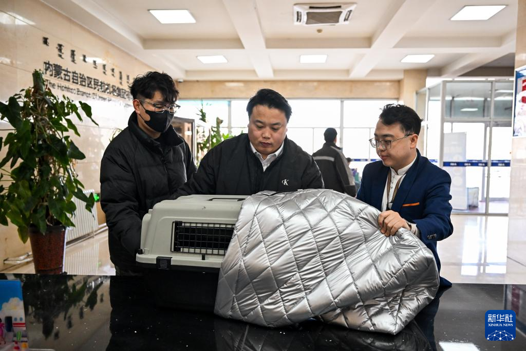2月6日,在呼和浩特白塔国际机场,工作人员给待托运的宠物航空箱套上保温棉,让宠物在寒冷天气中能够舒适保温。
