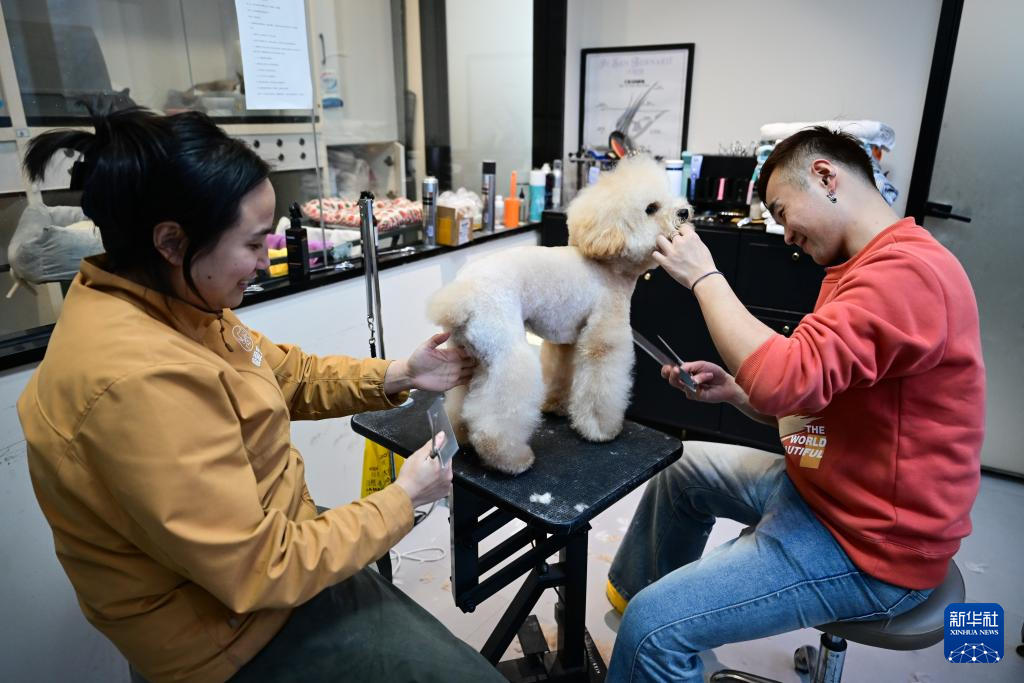 2月6日,在安徽省合肥市一家名叫“极爱宠物”的店内,工作人员给小狗做美容。