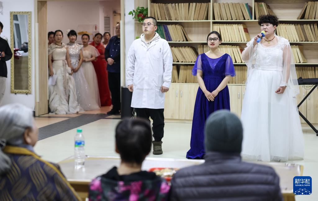 2月10日,养老院的工作人员在联欢会上表演节目。