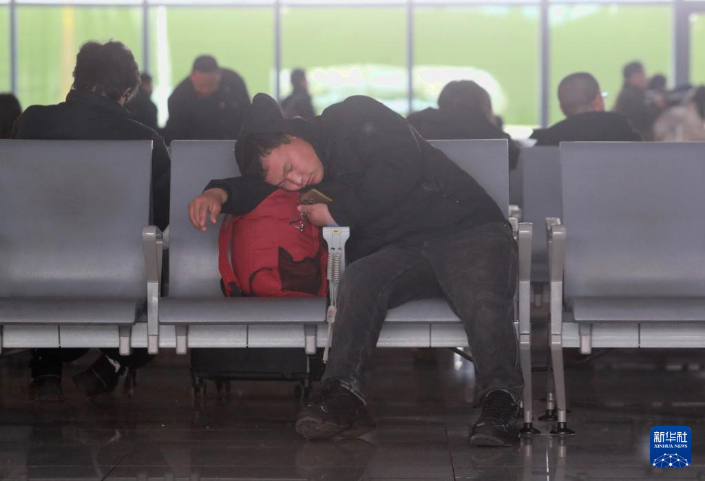 2月2日,旅客在江苏扬州东站候车大厅休息。