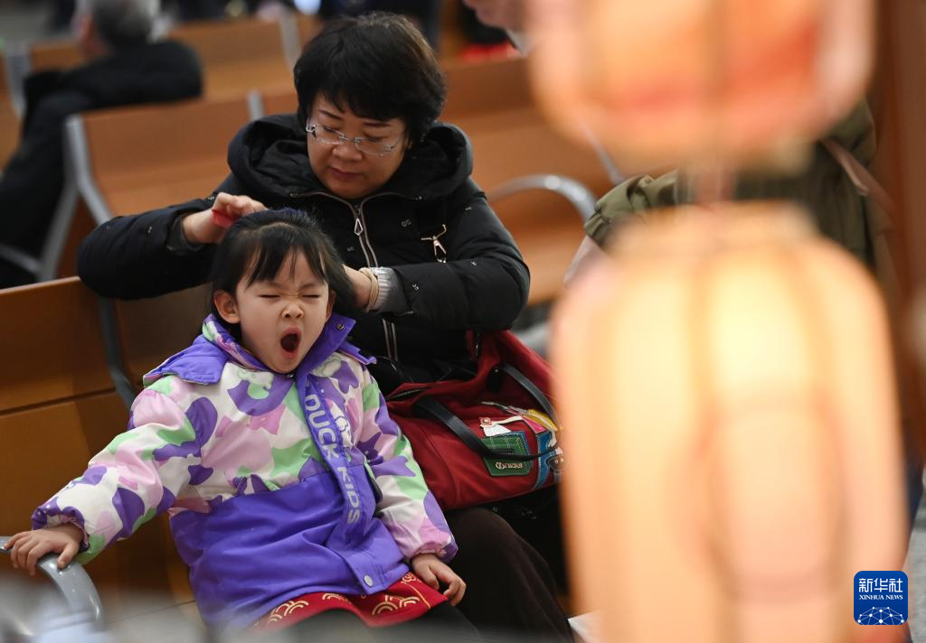 2月2日,在西安站候车大厅,旅客在候车期间为孩子梳头。