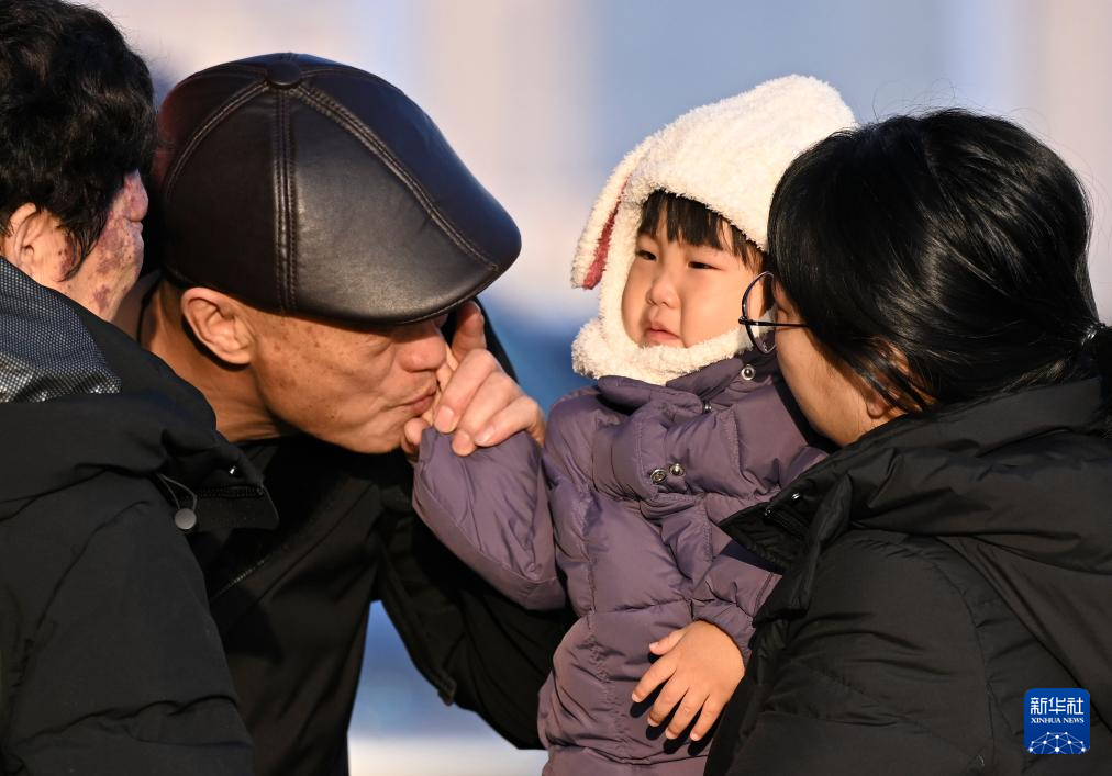 2月2日,在乌鲁木齐站,小朋友与家人告别。