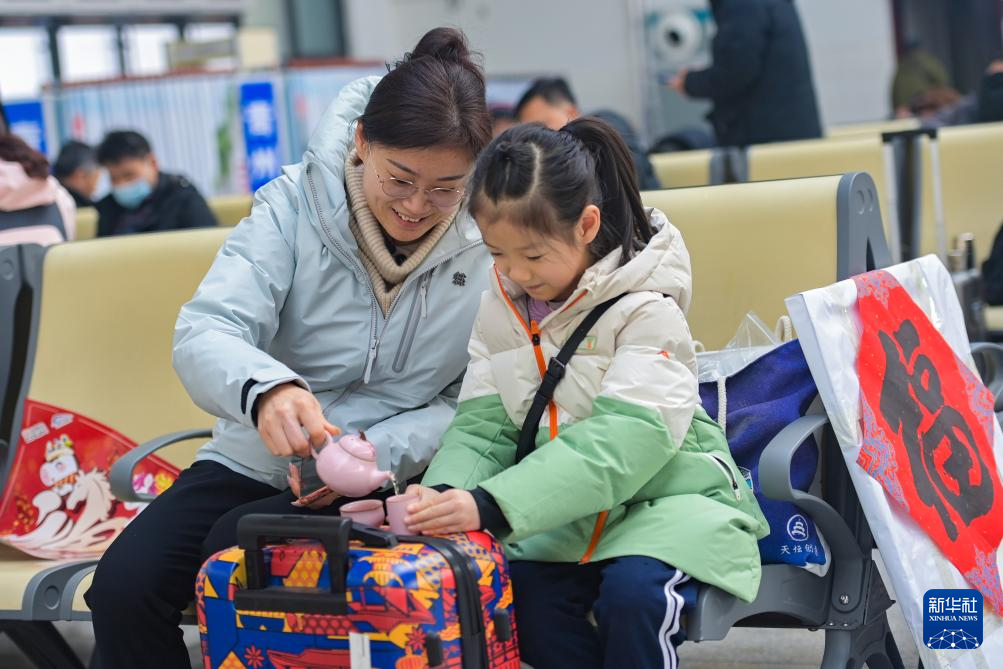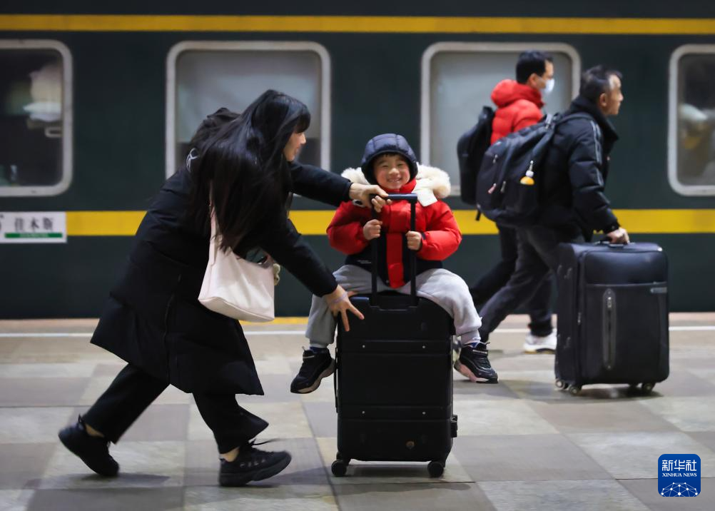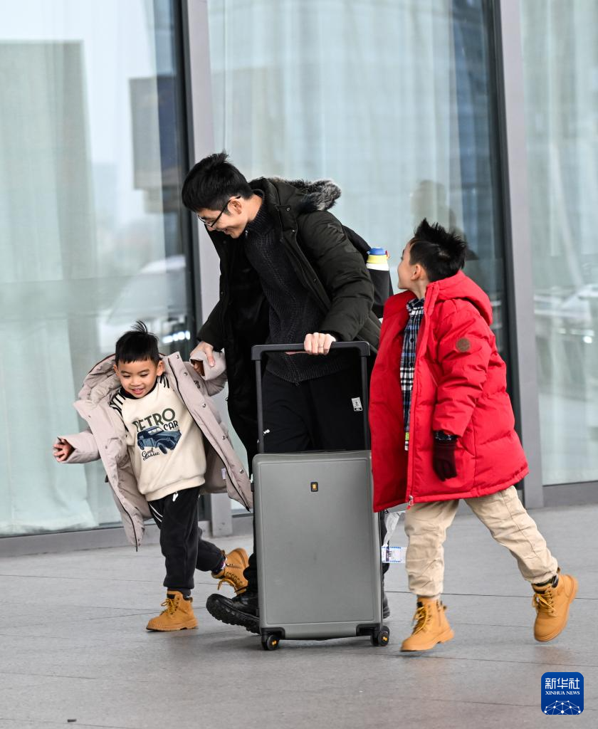 2月2日,旅客带着孩子在兰州西站乘车出行。