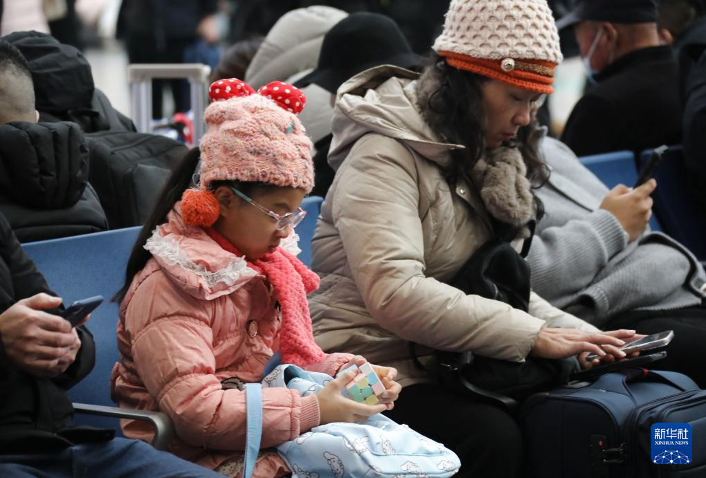 2月2日,在江苏苏州站候车大厅,小朋友在玩魔方。