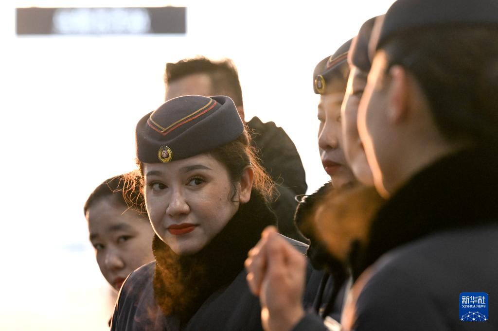 2月2日,在乌鲁木齐站,乘务人员在上车前进行工作交流。