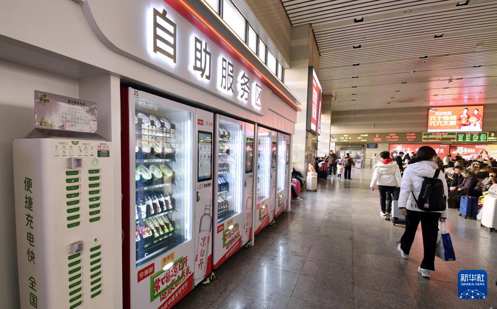 2月12日拍摄的北京西站候车大厅内的便民自助服务区。