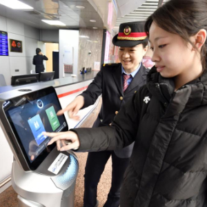 2月12日,旅客用北京西站的车次咨询机器人查询出行信息。