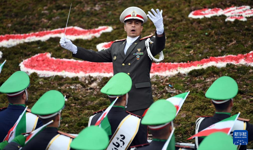 2月11日,在伊朗首都德黑兰阿扎迪广场,军乐队在纪念伊朗伊斯兰革命胜利47周年集会上演奏乐曲。