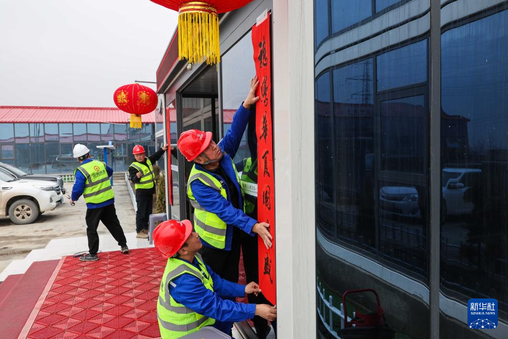 2月12日,在吉尔吉斯斯坦贾拉拉巴德州,中吉乌铁路项目10标段职工在贴春联、挂灯笼。