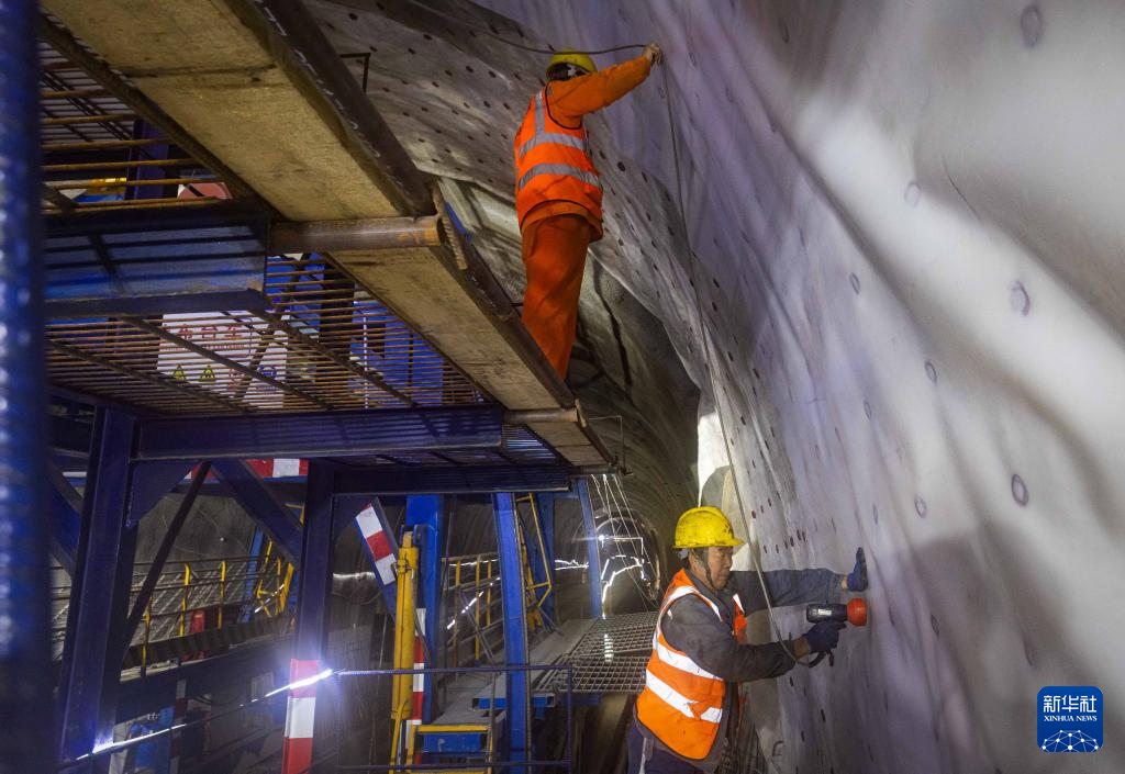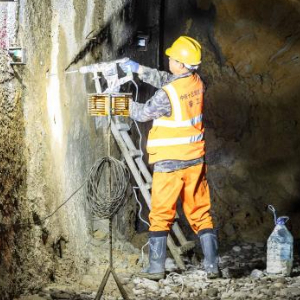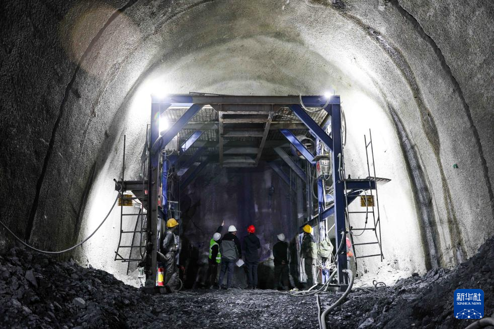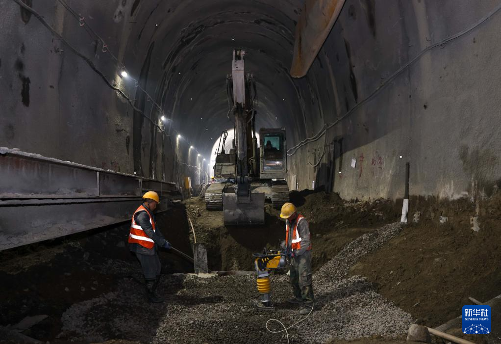 2月13日,在吉尔吉斯斯坦贾拉拉巴德州,中国建设工人在中吉乌铁路贾拉拉巴德隧道施工作业。