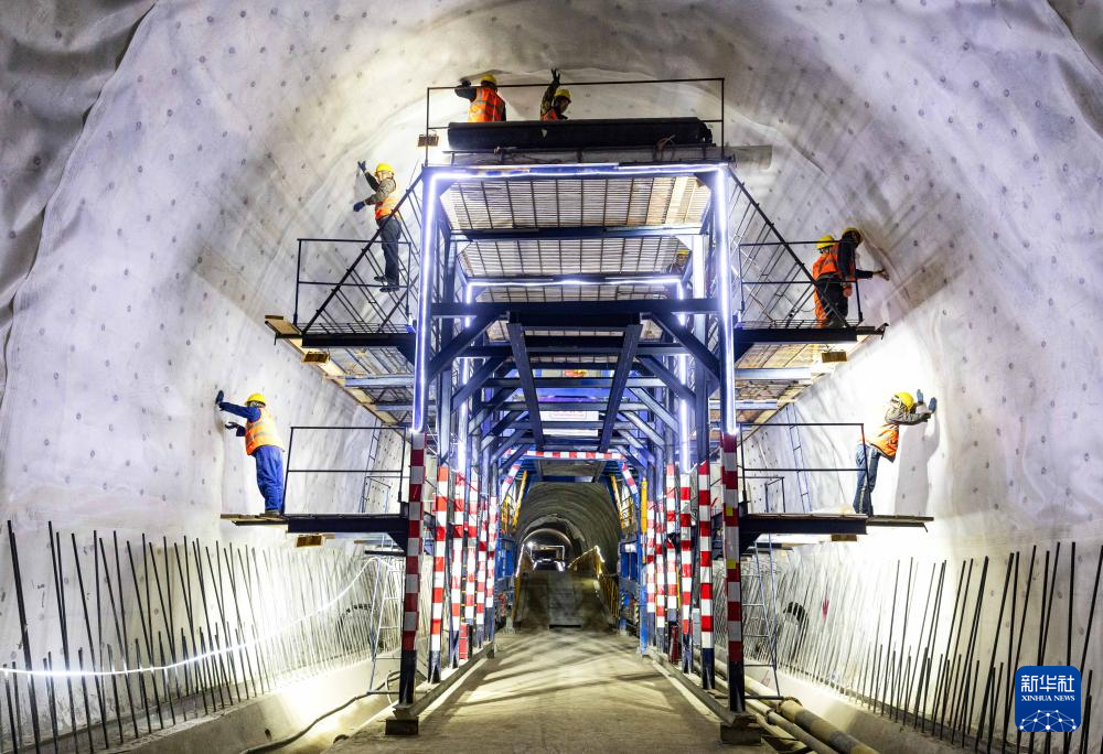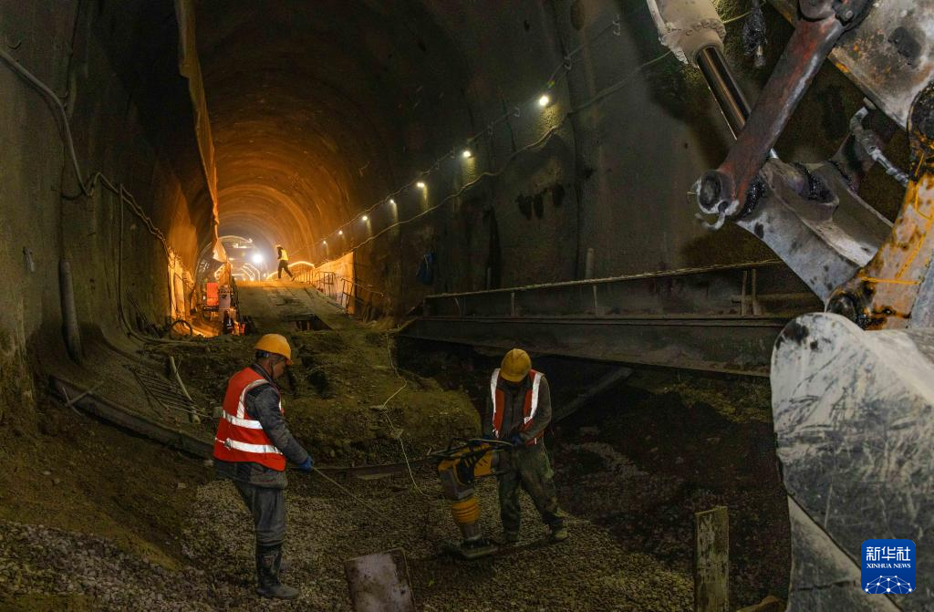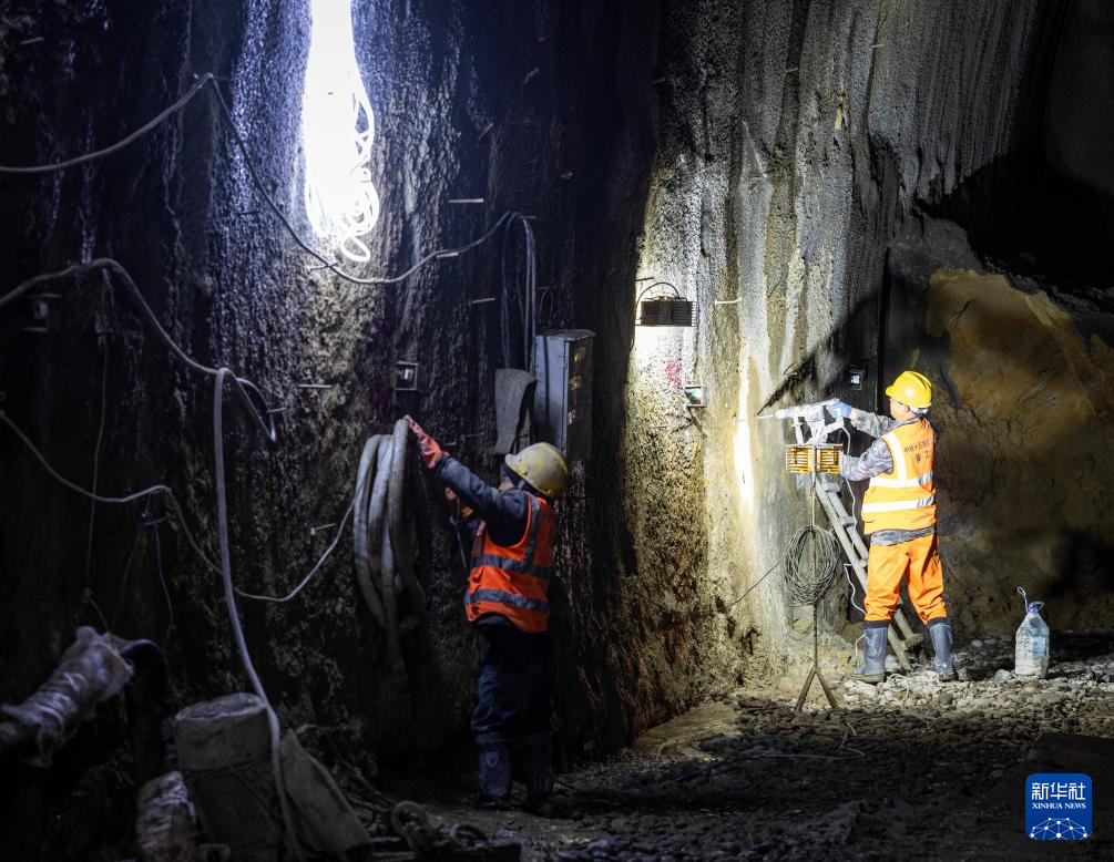 2月10日,在吉尔吉斯斯坦贾拉拉巴德州,中国建设工人在隧道内作业。