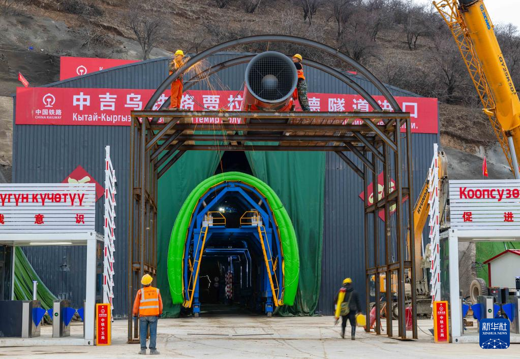 2月11日,在吉尔吉斯斯坦贾拉拉巴德州,中国建设工人为中吉乌铁路贾拉拉巴德隧道安装隧道通风设备。