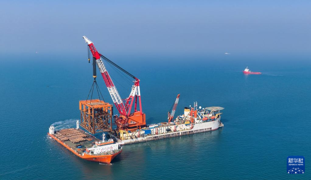 这是2月13日拍摄的渤中26-6油田开发项目(二期)导管架安装现场(无人机照片)。