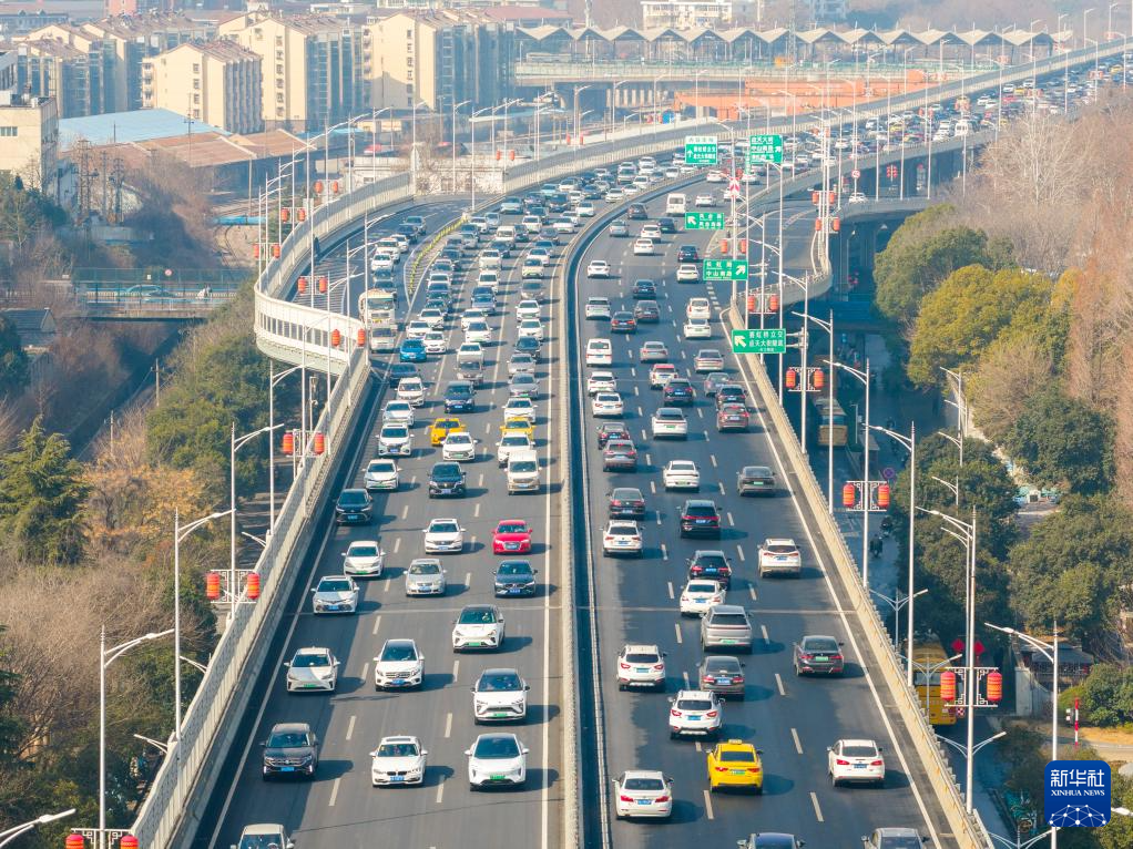 2月14日,车辆在江苏南京内环南线上通行(无人机照片)。