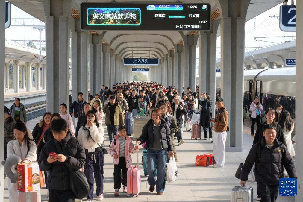 2月13日,旅客乘坐高铁抵达贵州兴义南站。