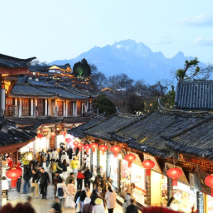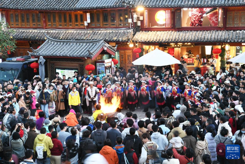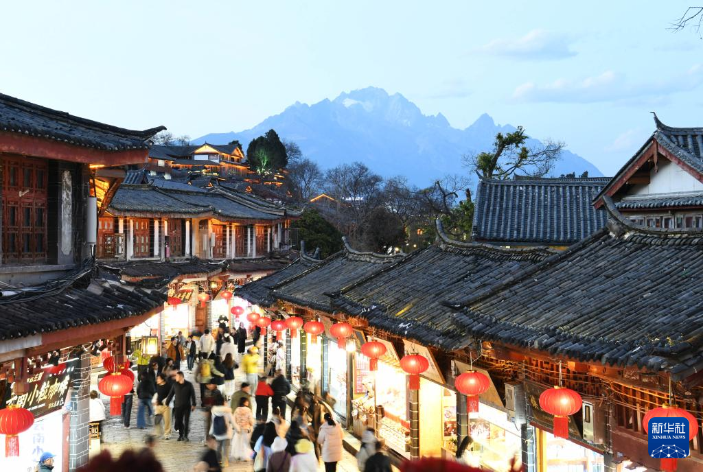 春节将至,云南丽江古城灯火璀璨,年味十足。游人络绎不绝,夜间消费市场一派热闹景象。