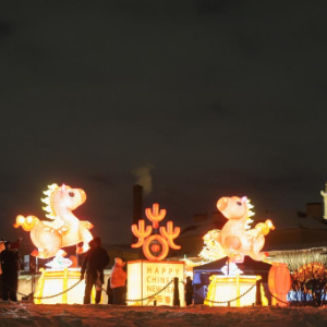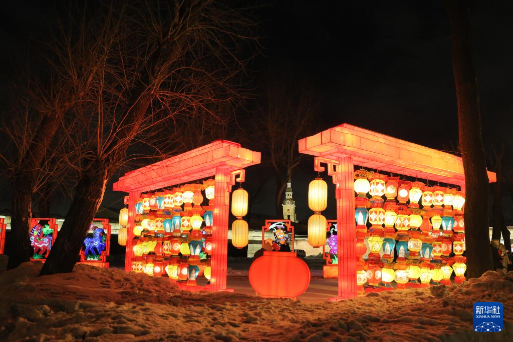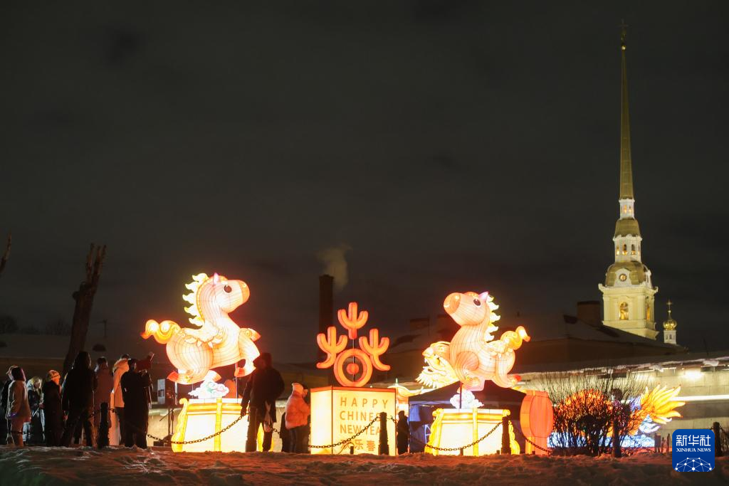 2月15日晚,10组中国四川自贡花灯亮相俄罗斯圣彼得堡涅瓦河畔。