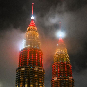 2月16日,在马来西亚首都吉隆坡,马来西亚国家石油公司双塔换上春节主题灯光迎接春节到来。
