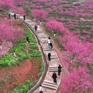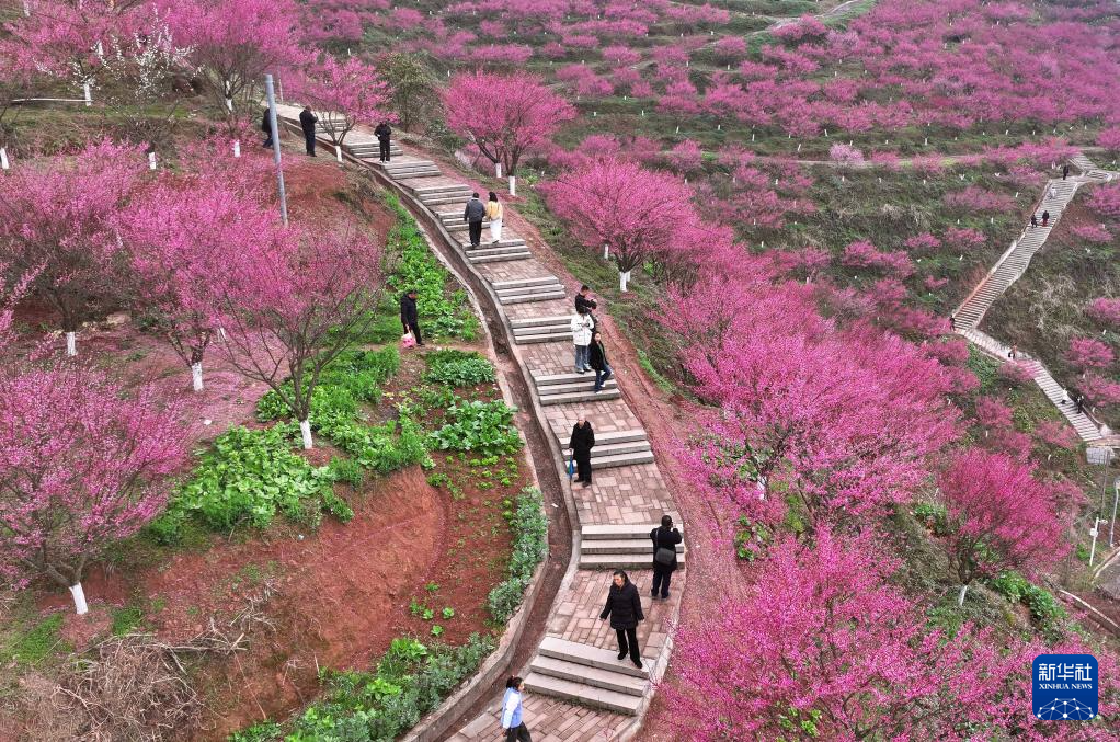 2月17日,游客在湖北省宣恩县城郊的花园堡梅园赏梅游玩(无人机照片)。