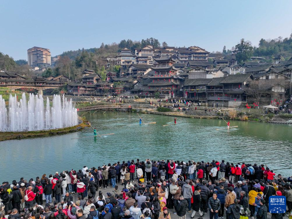 2月17日,游客在贵州省遵义市乌江寨景区观看独竹漂表演(无人机照片)。