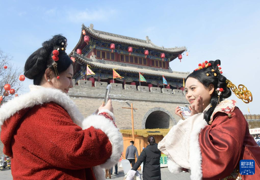 2月17日,身着传统服装的游客在河南省鹤壁市浚县古城拍照。