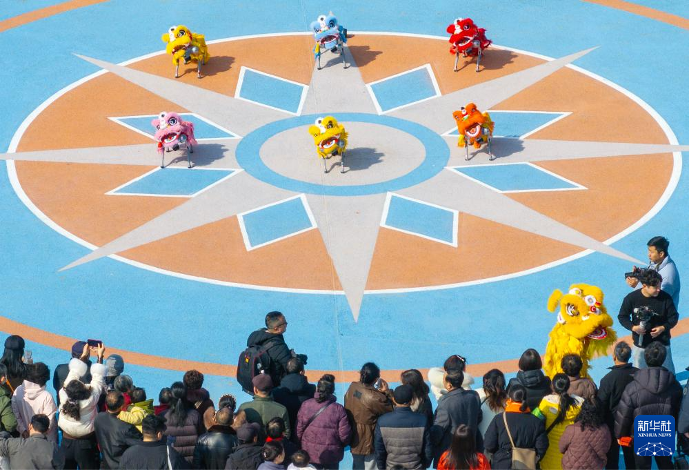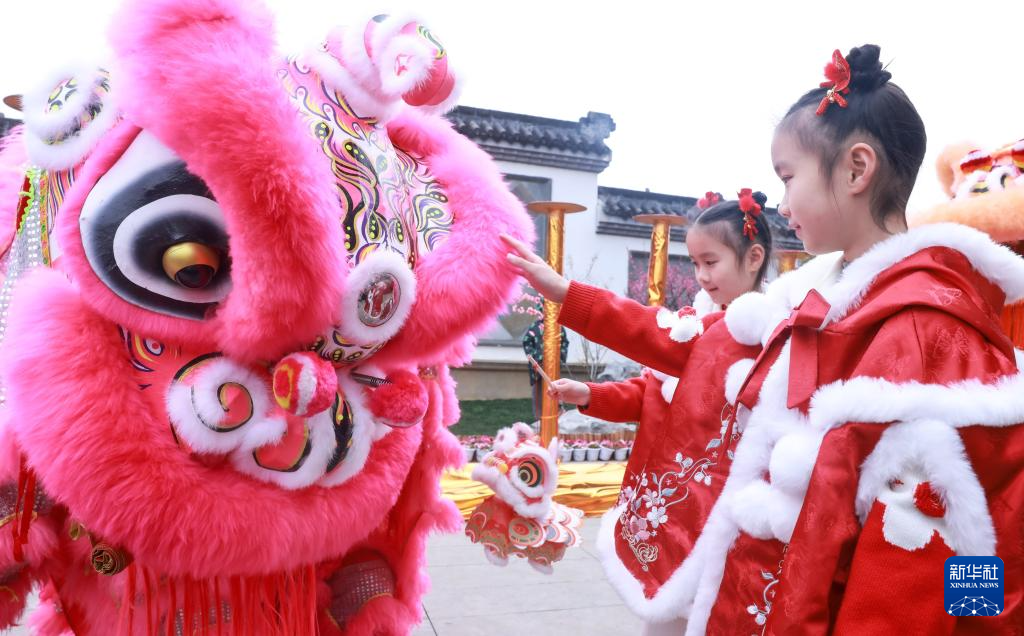 2月17日,在湖北省武汉市东湖梅园,两名穿着传统服饰的小女孩与舞狮民间艺人互动。