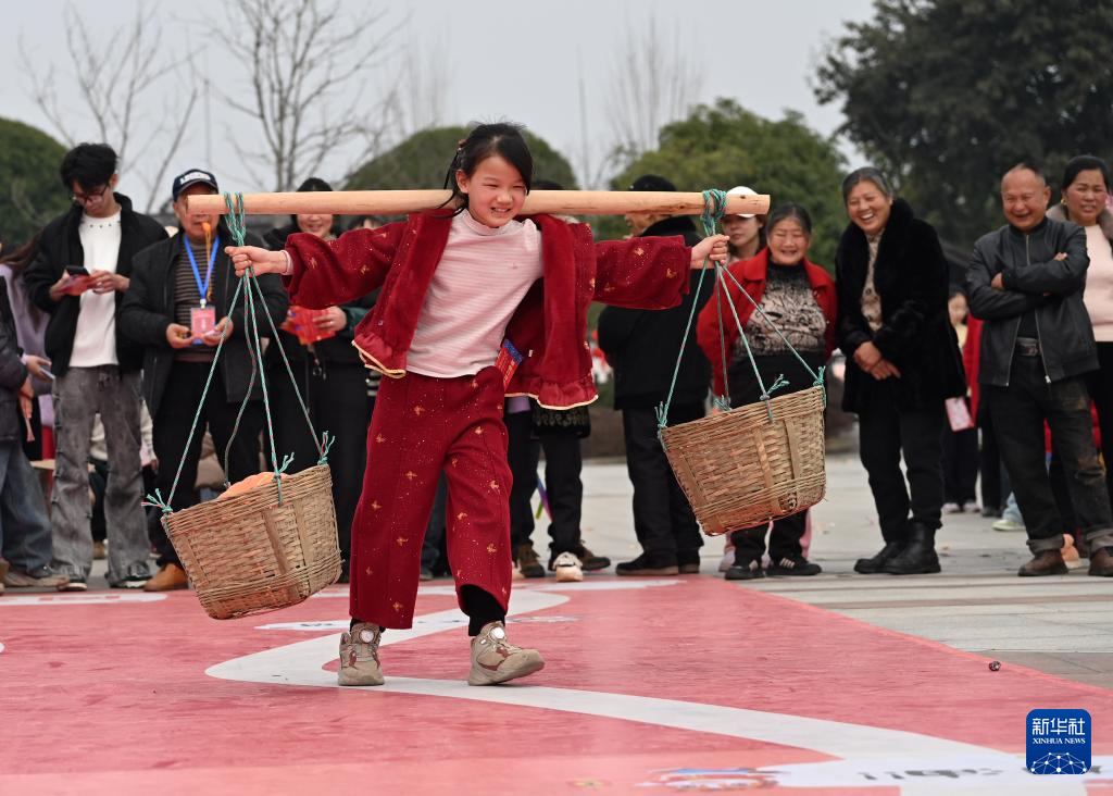 2月17日,在四川省内江市东兴区范长江文化旅游园,小朋友参加趣味“运粮”比赛。