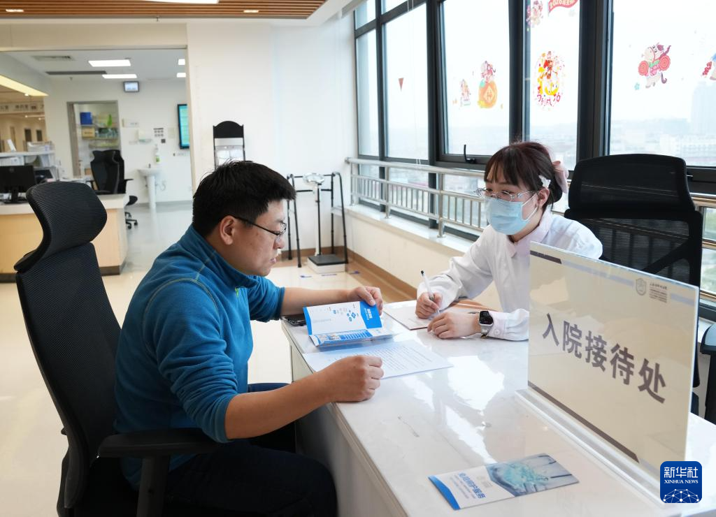 2月26日,在上海市肺科医院外科病区,患者家属在了解免陪照护服务的内容。