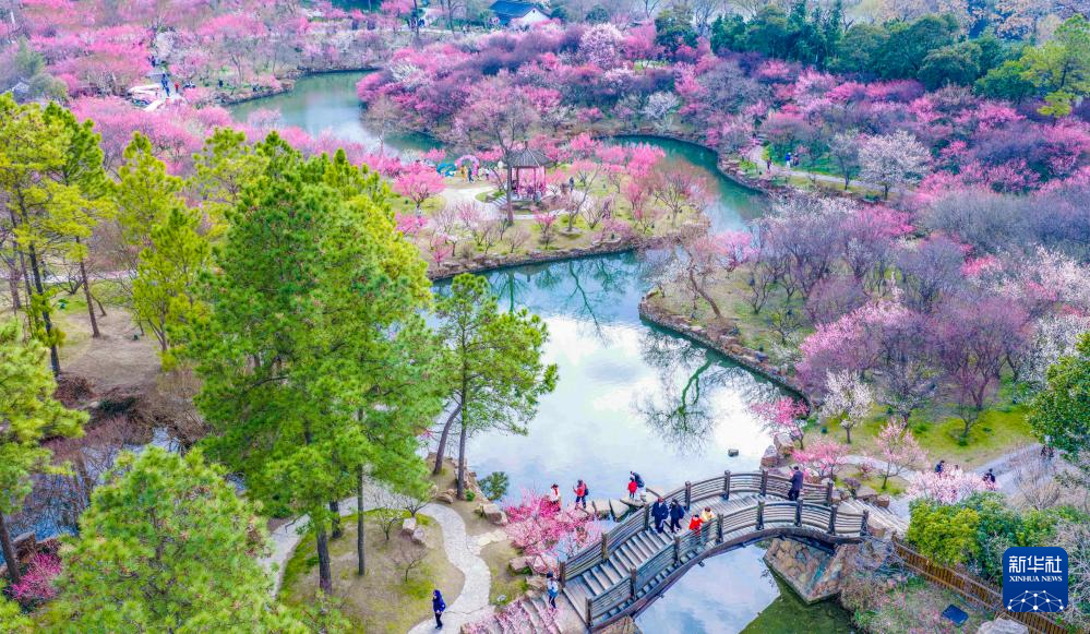 2月25日,游客在江苏南京明孝陵梅花山上赏梅踏春(无人机照片)。