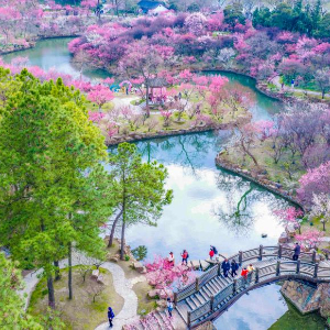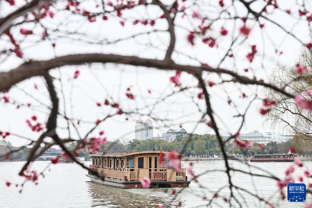 2月25日,游客在江苏扬州瘦西湖风景区赏梅游玩(无人机照片)。