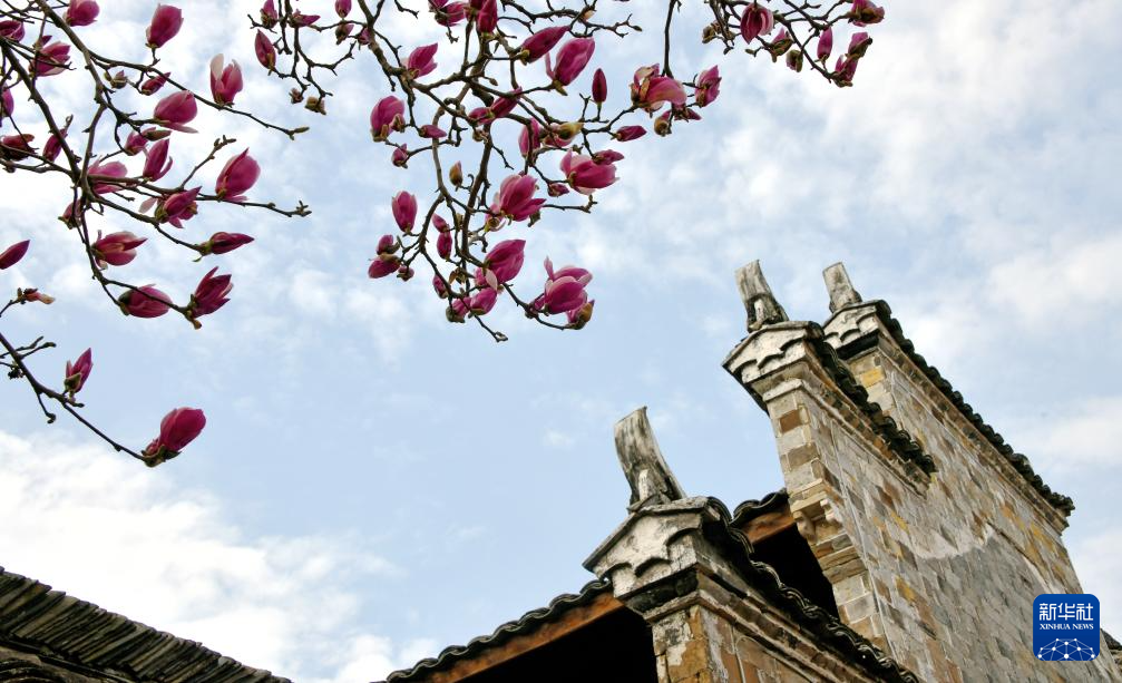 2月26日在浙江省台州市仙居县埠头镇西亚村拍摄的玉兰花和民居。