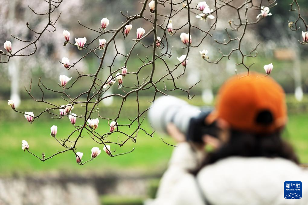 2月25日,游客在江苏省南京市雨花台风景区拍摄宝华玉兰。