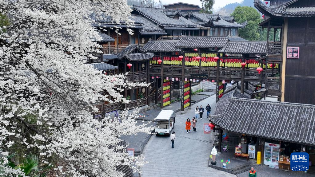 2月25日,游客在重庆市酉阳土家族苗族自治县酉州古城景区赏花游玩(无人机照片)。