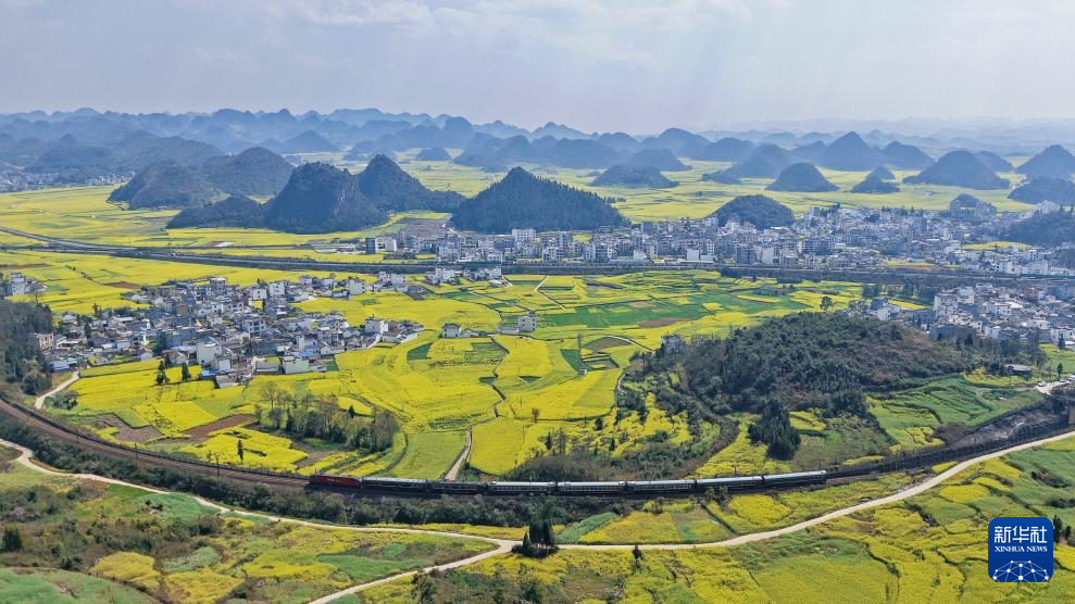 2月26日,赏花旅游专列在云南省曲靖市罗平县油菜花海中行驶(无人机照片)。
