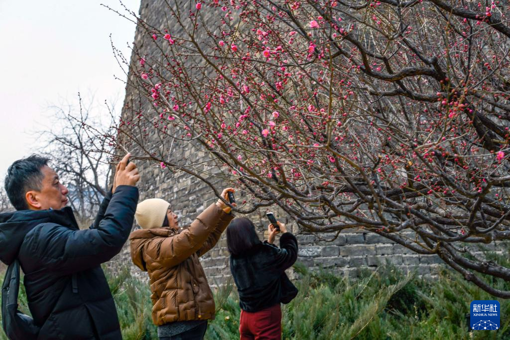 2月26日,游客在北京市明城墙遗址公园赏花拍照。