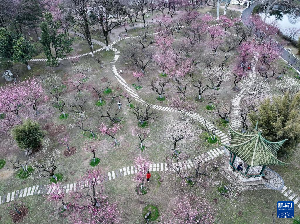 2月26日,游客在湖北省武汉市青山公园赏花游玩(无人机照片)。