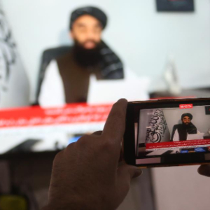 这是2月27日在阿富汗喀布尔拍摄的阿富汗政府发言人穆贾希德在新闻发布会上发言的电视画面。