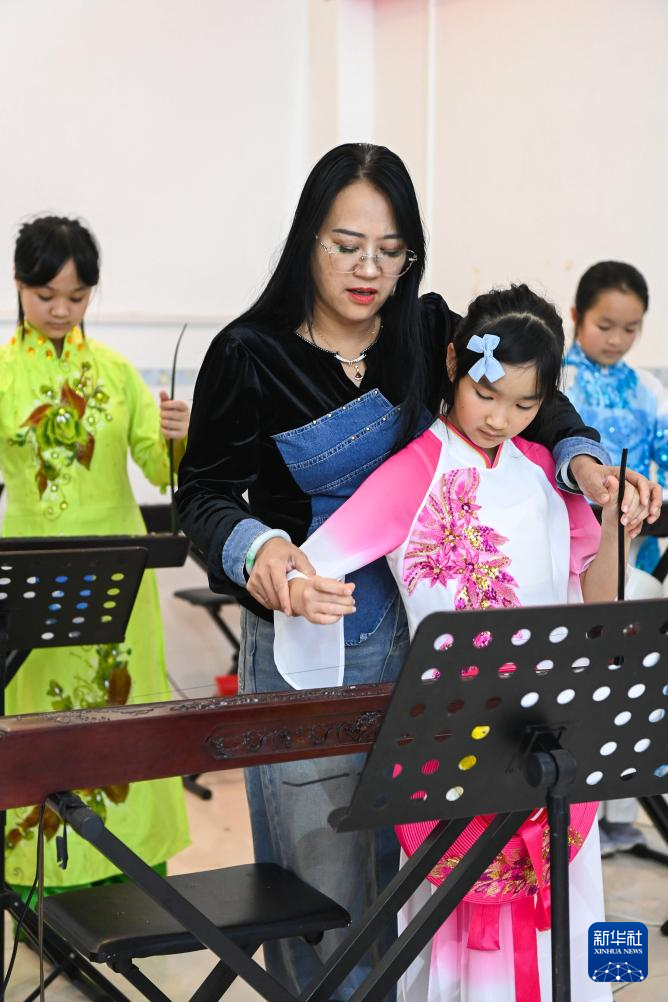 2月6日,在位于广西东兴市的工作室内,苏海珍指导学生弹奏独弦琴。