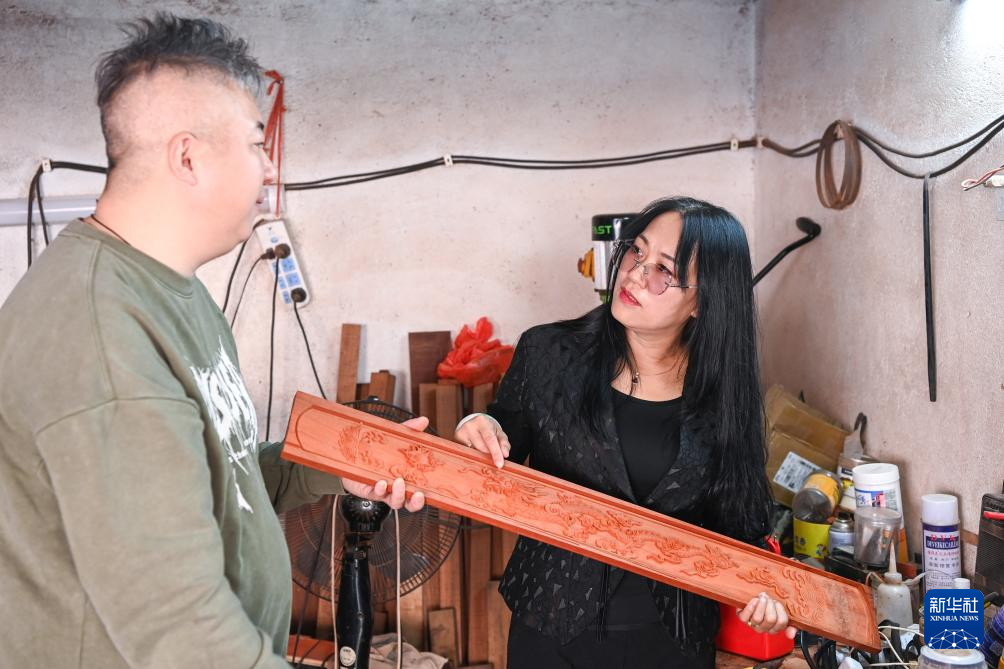 2月7日,在广西东兴市,苏海珍(右)与独弦琴制作匠人讨论琴身材质和纹饰。