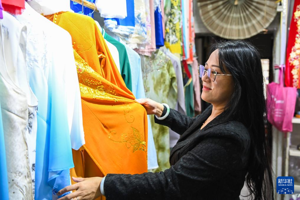 2月7日,在广西东兴市,苏海珍在调研京族服饰的创新与销售情况。