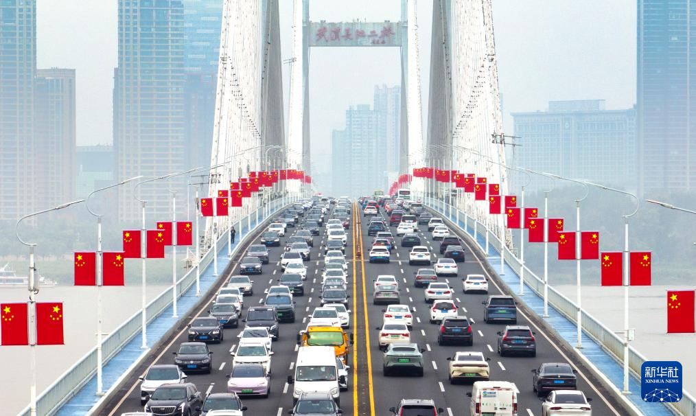 2025年10月1日,国庆假期第一天,车辆行驶在湖北省武汉长江二桥上(无人机照片)。近年来,假日消费拉动作用增强,新的消费模式和业态层出不穷。