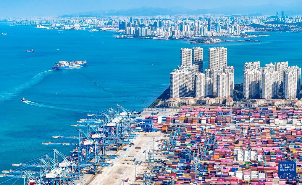 一艘货轮满载货物驶出青岛自贸片区(2025年11月5日摄,无人机照片)。“十四五”时期,我国累计进出口规模突破200万亿元,比“十三五”时期增长四成,进口国际市场份额保持在10%左右,5年累计进口规模超过90万亿元,出口国际市场份额保持在14%以上,货物贸易大国地位稳固。