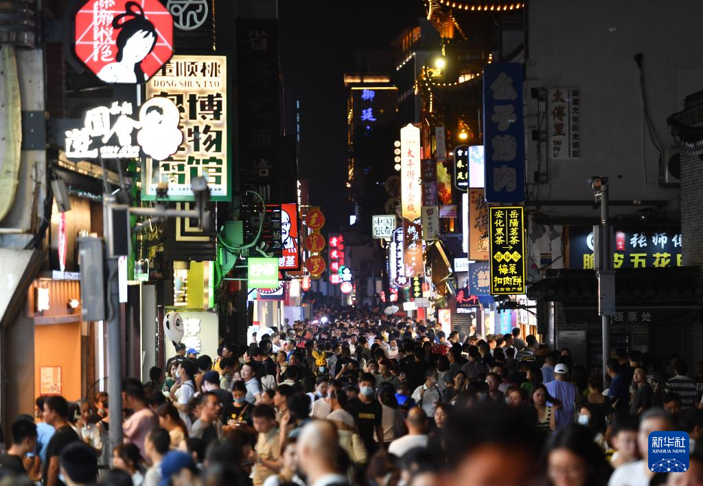 游客在长沙市太平古街休闲游览(2022年7月29日摄)。“十四五”期间,非物质文化遗产、文博IP等消费爆款频现,城市漫步、中式茶饮等成为时尚消费潮流,各地推行各类优惠、补贴,释放消费潜能,激发市场活力。
